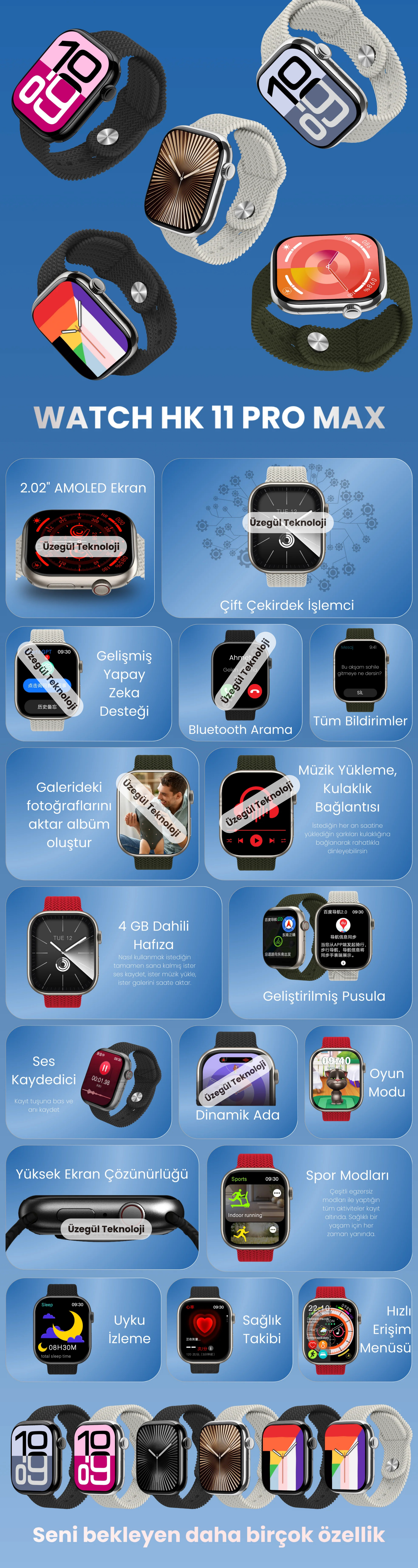 Zengin özellikleri ile kullanıcısına yeni bir dünyanın kapılarını aralayan Watch HK 11 Pro Max; Bileğinden hiç çıkarmak istemeyeceğin kaliteli akıllı saat deneyimini yüksek teknolojisiyle birleştirerek, kullanım zevkini zirveye çıkarıyor.